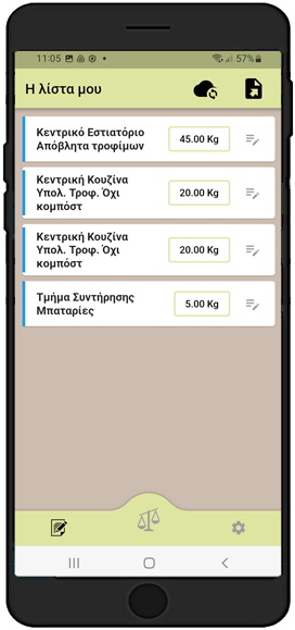 Στη συνέχεια επιλέξτε το ΣΗΜΕΙΟ όπου δημιουργήθηκε το απόβλητο που θέλετε να καταγράψετε (π.χ. Αποθήκη ξηράς τροφής, Κεντρική κουζίνα, Α la carte εστιατόριο) και αμέσως θα εμφανιστεί η οθόνη ζύγισης.