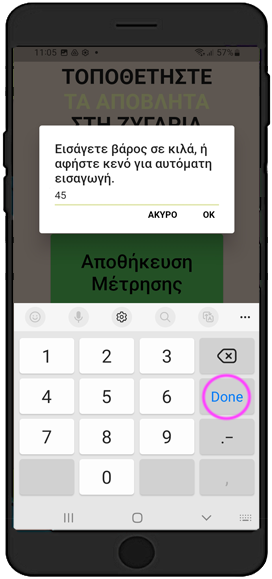Εφόσον έχετε τοποθετήσει τα απόβλητα στον προτεινόμενο ζυγό Bluetooth®, η ένδειξη του βάρους θα εμφανιστεί αυτόματα στο ειδικό πεδίο του App, οπότε απλά πατήσετε το πλήκτρο «Αποθήκευση Μέτρησης».