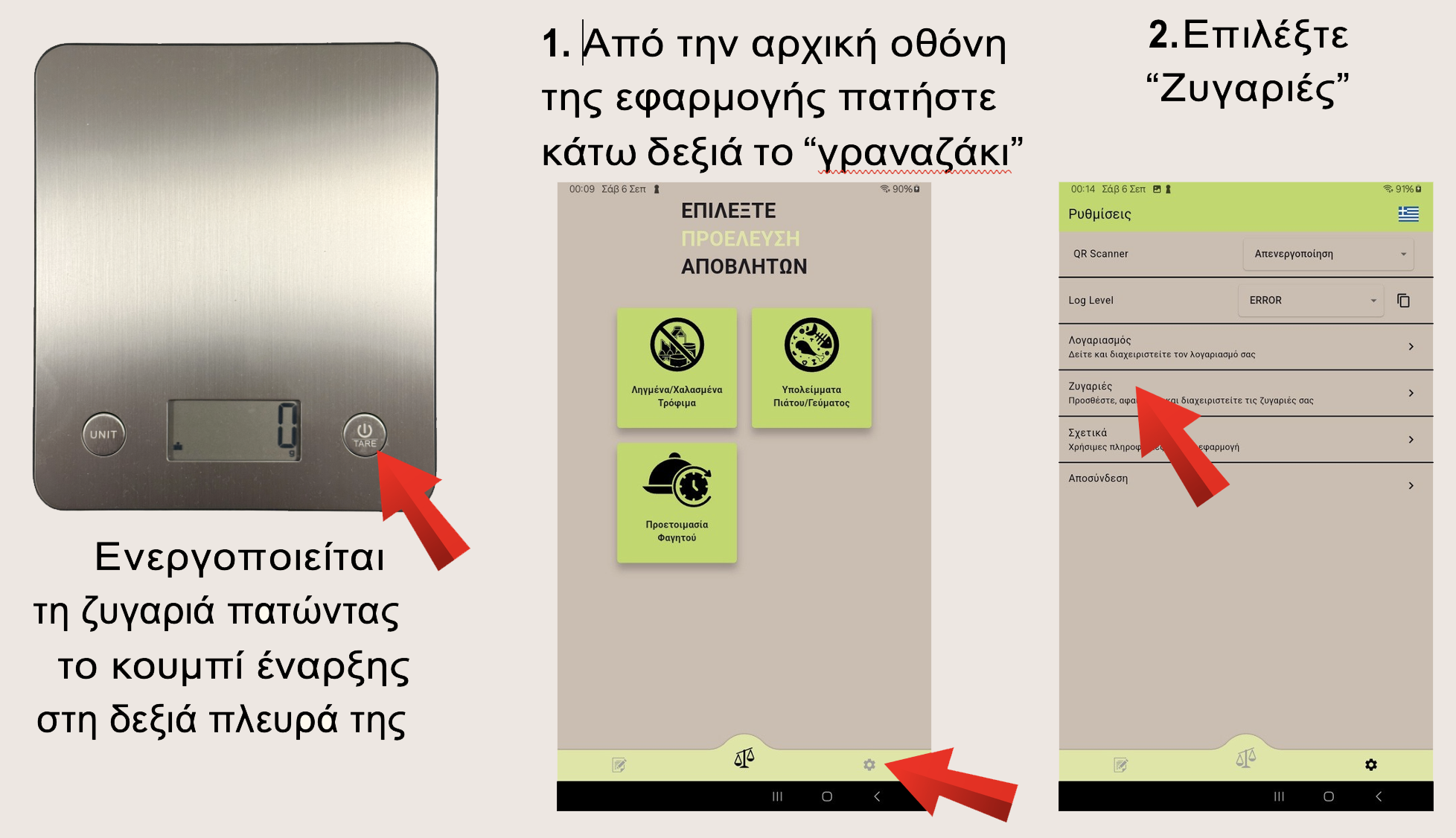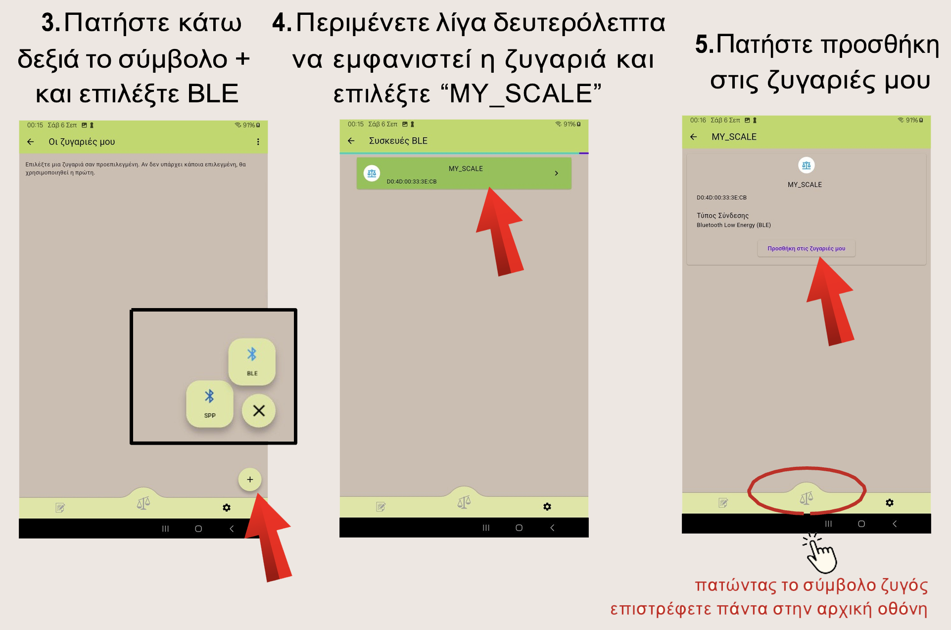 Η διαδικασία σύνδεσης της ζυγαριάς γίνεται μόνο μέσα από την εφαρμογή και χρειάζεται να γίνει μόνο την πρώτη φορά, φέρνοντας σε κοντινή απόσταση τη ζυγαριά με το smart-phone ή το tablet που θα χρησιμοποιείτε κατά την περίοδο μετρήσεων (αφού έχετε τοποθετήσει τις μπαταρίες στη ζυγαριά).